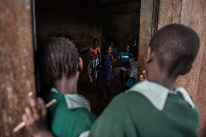 Phylis nimmt in der Mitte der Mehrzweckhalle Aufstellung. Durch winzige Fenster fallen Lichtkegel wie Spotlights. Staub flirrt. Das Mädchen hält die Arme leicht gerundet vor sich in Bauchhöhe, ihren Körper zur Seite geneigt, die Füße sind nebeneinander abgespreizt, sodass sich die Fersen leicht berühren. Zwei Dutzend Kinder halten die gleiche Position, in Armlänge voneinander entfernt, alle in bunten Ballettanzügen und Schläppchen. «Erste Position», ruft Tanzlehrer Mishael Okumu. Dann tippt er in sein Handy, an dem ein tragbarer Lautsprecher hängt – und schon erklingt die Menschliche Komödie von Dmitri Schostakowitsch.